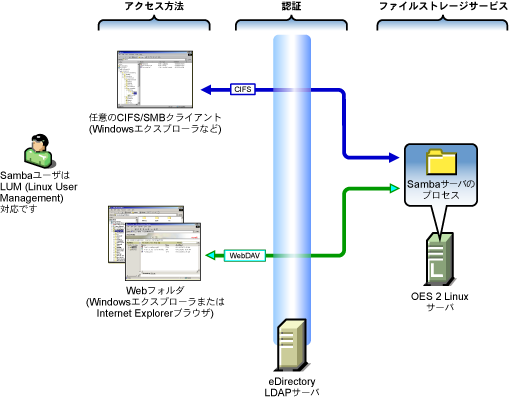ファイルサービスアクセスは、eDirectory LDAPサーバを介したLDAPベースの認証によって制御されます。 別々に表示されていますが、eDirectoryはOES 2サーバで実行できます。 |