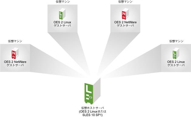 Open Enterprise Server 2では、単一Xenホストサーバ(OES 2 LinuxまたはSUSE Linux Enterprise Server 10 SP1のいずれか)で稼働する、Xen仮想マシン(VM)上で複数のOES 2サーバをホストできます。