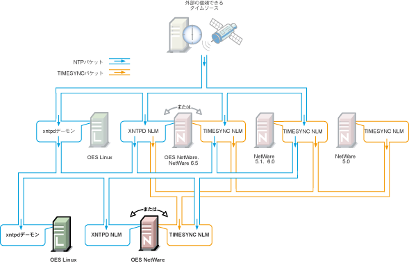 このためeDirectoryツリーにNetWare 4.2または 5.0サーバが含まれている場合、OES 2 Linuxサーバをインストールするには、NTPおよびTimesyncの時刻パケット間の「ブリッジ」として機能するNetWare 5.1以降のサーバが少なくとも1台必要です。図 12-5に示すように、これら旧バージョンのサーバはOES 2 NetWareサーバを介して同期化できます。
