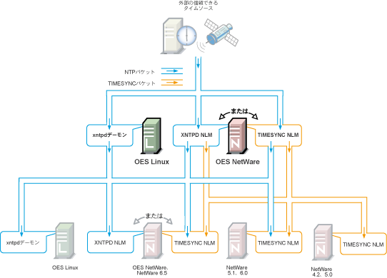 OES eDirectoryツリーには、OES 2 Linux、OES 2 NetWareまたは旧バージョンのNetWareのいずれか1つ以上を実行するサーバが含まれている可能性があるため、各オペレーティングシステムで使用される時刻同期モジュールの違いや、これらのモジュール間での通信方法について理解している必要があります。