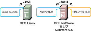 図 12-1に示すように、OES 2 NetWare (およびNetWare 6.5)はNTP (Network Time Protocol)またはTimesyncモジュールのいずれかを使用して時刻を同期できます。両方のモジュールとも、NTPを使用してOES 2 Linuxと通信できます。