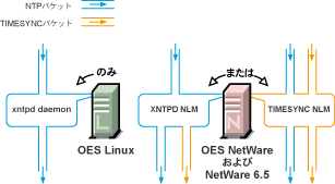OES 2 LinuxサーバとNetWareサーバは、時刻を同期するために相互に通信する必要がありますが、Linuxの時刻同期にはNTPのみが使用されるため、双方でNTP時刻パケットを使用して時刻同期の情報をやりとりする必要があります。