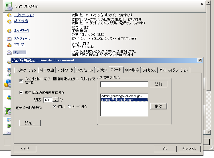 次の内容について、指定したアドレスに電子メール経由で通知を自動送信するようにマイグレーションジョブを設定できます。