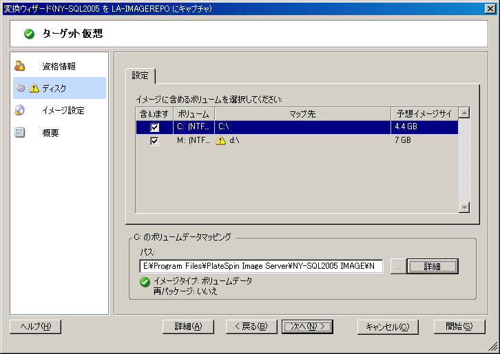 ウィザードモードでイメージのキャプチャジョブやイメージのインポートジョブを設定する場合は、このページを使用して、イメージに含めるボリュームを選択したり、既存のボリュームデータへのパスを指定したりします。
