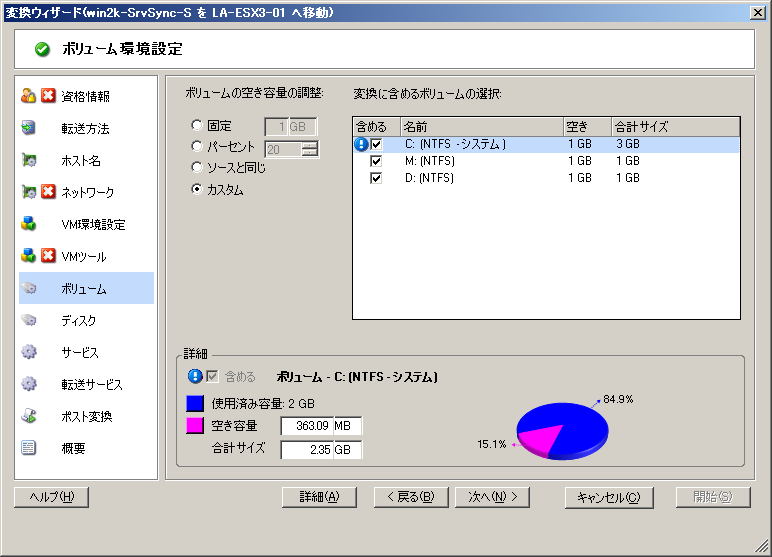 ワークロードを仮想化する場合、ターゲットに含めるボリュームを選択し、それらの空き領域のサイズを管理できます。また、ターゲットの仮想化プラットフォームのストレージメディアの環境設定や仮想ディスクの処理機能に従って、ソース上の物理ディスクの配置がピアの仮想マシンに伝播される方法も制御できます。