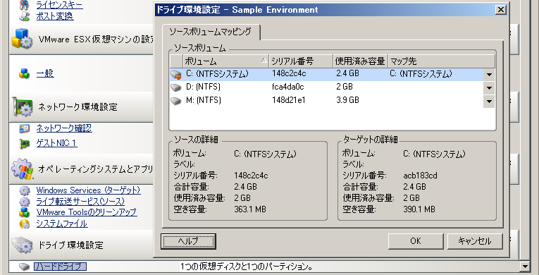 Windowsワークロードのサーバ同期ジョブは、ソースおよびターゲットの詳細なドライブおよびボリュームの情報を提供し、必要なマッピングを指定することができます。