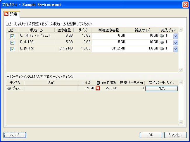 これらの設定を使用して、コピーするソースボリューム、再作成およびサイズ調整するボリュームソース以外の領域、および再パーティションと入力を行うターゲットディスクを選択します。
