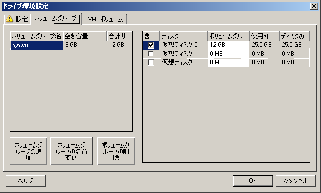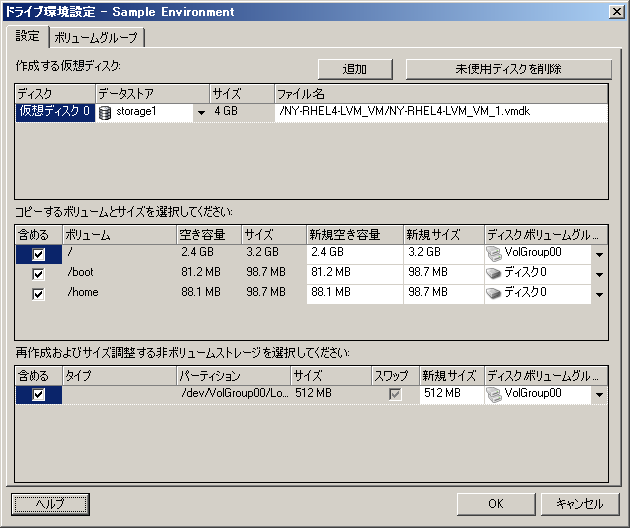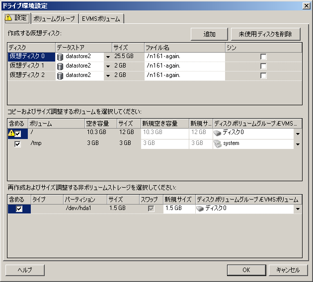 このウィザードのページを使用して、LVM (Logical Volume Manager)ボリュームグループを管理します。このページは、ソースにLVMがインストールされている場合のみ表示されます。