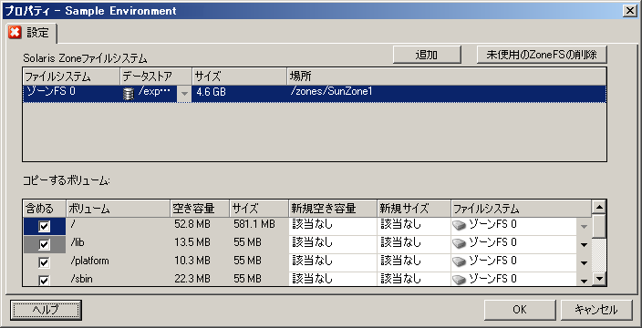 : この領域のオプションは、ターゲット上のゾーンファイルシステムの管理についての情報および管理の手段を提供します。ファイルシステムでは、およびの値は変更できません。ゾーンに指定したゾーンパスに基づいて計算されます。およびの値を変更するには、ターゲットのゾーンの環境設定の設定(Solarisのゾーンの構成参照)で、およびの値を変更します。 新しいファイルシステムを追加するには、をクリックし、[データストア]カラムに必要なターゲットディレクトリを指定します。ターゲット上で不要になったファイルシステムを削除するには、をクリックします。 : この領域のオプションは、ソース上で検出されたボリュームに関する情報を提供し、ターゲットのゾーンで再生するボリュームを選択できるようにします。再生対象に選択したボリュームには、上部のリストからファイルシステムを指定できます。ルートボリュームは、選択解除できません(マイグレーションから除外)。これは常に選択され、ファイルシステムに割り当てられています。 |