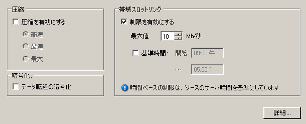 ジョブの帯域幅を指定した速度に制限するためには、[]を選択し、必要な最大値をMbpsで指定し、任意に制限を課する期間を指定します。指定された場合、ソースワークロードのシステム時間に基づいた[]と[]時間値。