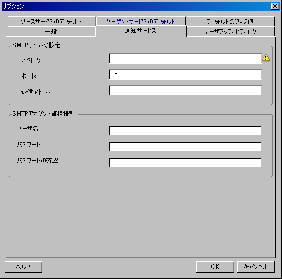 このタブを使用して、イベントおよびジョブの進行状況を通知するためのSMTP (Simple Mail Transfer Protocol)サーバの設定を指定します。Portability Suite Clientでこのダイアログボックスにアクセスするには、>の順にクリックします。