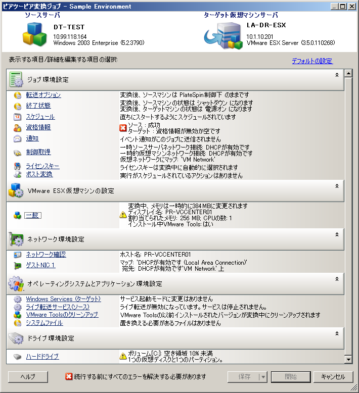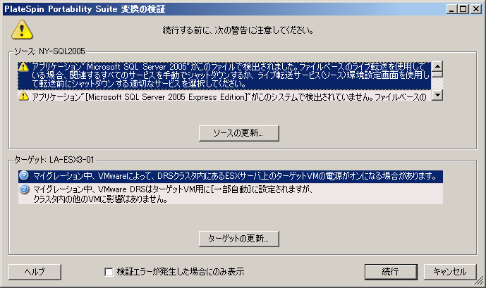 変換ジョブを開始する際、Portability Suiteによって、ジョブタイプ、ソース、ターゲット、および選択したパラメータが検証され、エラーおよび警告が生成される可能性があります。