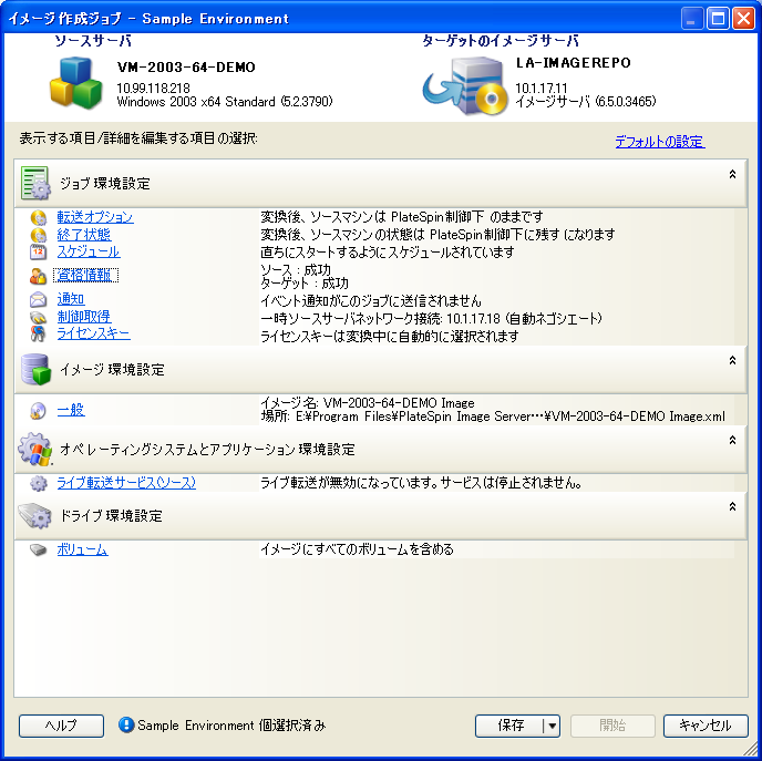 各カテゴリに含まれるリンクをクリックし、変換ジョブに必要な設定を指定します。