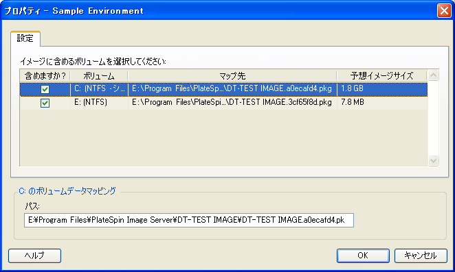 ドライブ環境設定: Portability Suiteがイメージに含めるボリュームを選択し、パッケージファイルへのパスを指定します([ドライブ環境設定]で、をクリックします)。