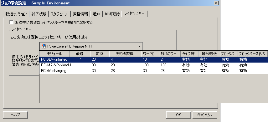 現在の変換で無効なライセンスがある場合は、それらのライセンスは選択できません。ライセンスは、次のような理由から無効な場合があります。