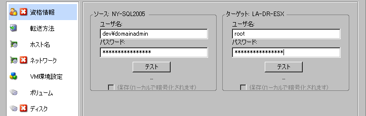変換ジョブを設定する際に、提供された資格情報の有効性をチェックし、同じソースおよびターゲットを使用する将来の変換ジョブ用にそれらの情報を保存できます。