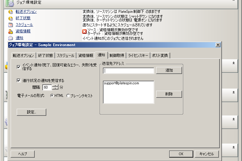 次の内容について、指定したアドレスに電子メールによる通知を自動送信するように変換ジョブを設定できます。