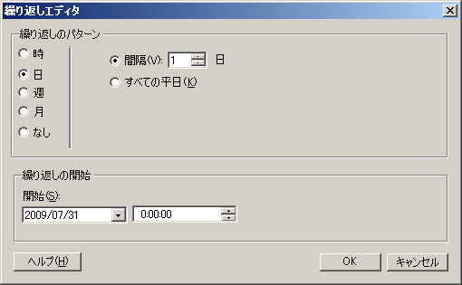 いずれかのスケジュールを編集するには、ジョブのスケジュール内のをクリックします。繰り返しエディタのダイアログボックスに表示されるオプションは、それ以前のジョブ環境設定の選択内容に依存します。