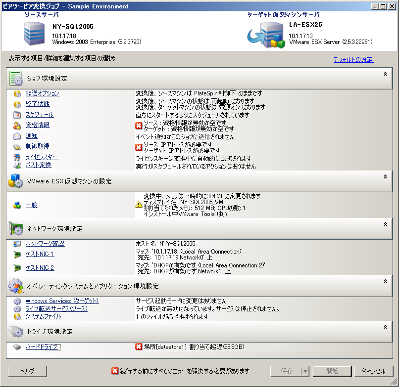 図 3-1 ピアツーピア変換ジョブのウィンドウ(詳細モードでのP2V)