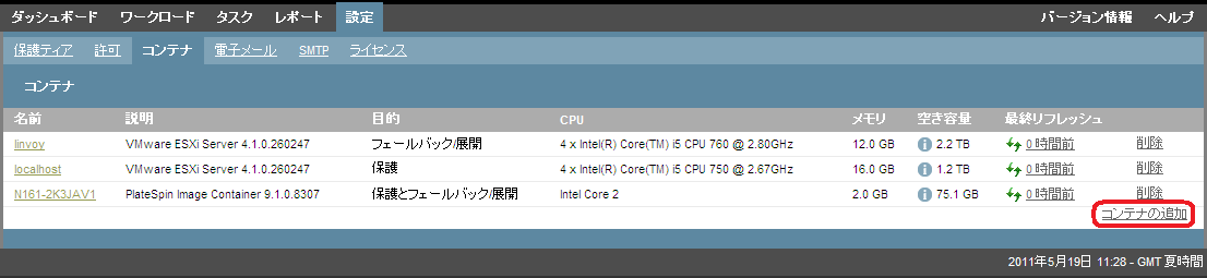 PlateSpin Protectによって[コンテナ]ページがリロードされ、追加されるコンテナのプロセスインジケータが表示されます