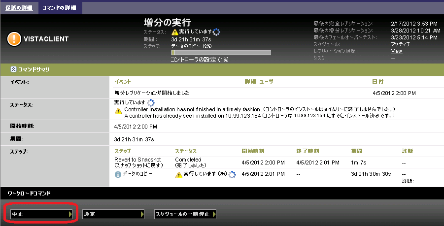 コマンドを実行した後、そのコマンドが実行中でも、特定のコマンドの[コマンドの詳細]ページでコマンドを中止できます。