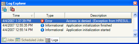 Log Explorerでは、一般的な情報、警告、またはエラーメッセージを確認できます。ここに表示されるメッセージは、特定のジョブまたはサーバに関連するものではありません。任意のログエントリを右クリックしてポップアップメニューを表示し、そこからログエントリの表示(View Details of a log entry)、ログエントリの削除(Delete a log entry)、またはログエントリのXML形式での表示(View XML format of log entry)のためのコマンドを選択できます。