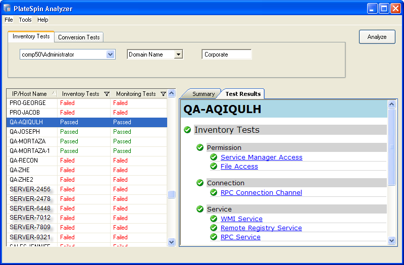 PlateSpin Analyzerでは、ネットワークをすばやく分析し、指定したWindowsサーバやUNIX/Linuxサーバのインベントリ、監視、または変換がPlateSpin Reconで成功するかどうかを判断します。これは、インベントリおよび変換という2つの異なるタイプのテストを実行します。