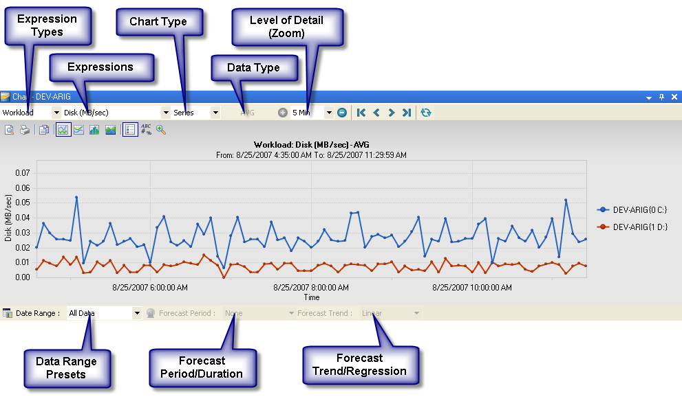 Zoom In/Zoom Out: 収集されたデータに対するチャートの粒度を調整します。セクション 5.1.3, 詳細のレベルを参照してください。 |