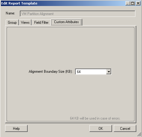 配置する必要があるディスクパーティションに対して、サイズをKBで選択または指定できます。デフォルト値は64KBです。指定した配置境界サイズは、ディスクパーティションオフセット値を計算するために使用されます。このタブは、「VMパーティション配置」レポートテンプレートと「VMホストパーティション配置」レポートテンプレートに対してのみ使用できます。