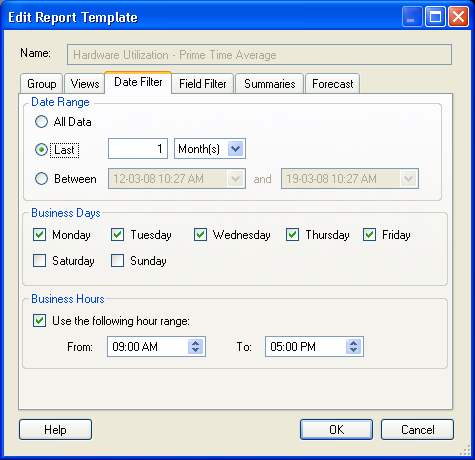 使用する期間をレポートに対して指定できます。このページでの設定は、[Date Filter]ページの上部での設定と同じです。[Date Filter]タブおよびセクション 5.3.5, 「診断」レポートテンプレートを参照してください。