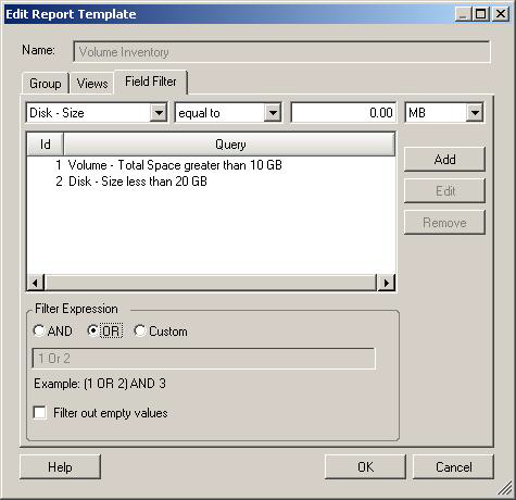 レポートに含める行または含めない行を決定するために使用されます。これは、レポートに含めるマシンや含めないマシンを制御する[]タブとは異なりますが、「Field Filter」条件を管理するためのガイドラインは、ここでも適用できます。[Field Filter]タブを参照してください。