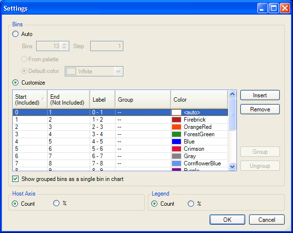 任意の数の連続ビンまたは非連続ビンを選択して、[]ボタンをクリックすると、それらをグループ化することができます。任意の1つのビンに対し、[]カラムでグループの名前を入力します。その名前は、グループの全メンバーに対して自動的に割り当てられます。