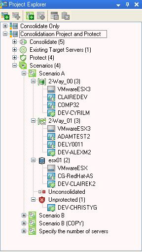 シナリオの結果は、使用するワークロードと選択したサーバテンプレートによって異なります。より大きなターゲットサーバでは、より高い統合率が得られます。作成されたシナリオは、Project Explorerに表示されます。次の図にあるアイコンの説明については、表 D-6にあるProject Explorerアイコンのリストを参照してください。