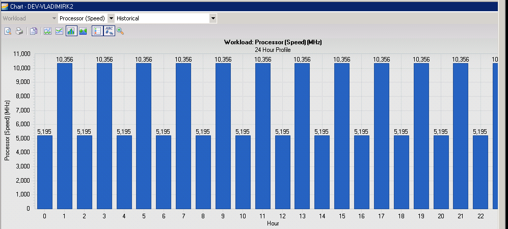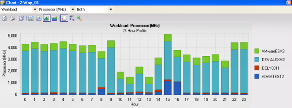 Data Center ExplorerとConsolidation Planning Moduleでは、24時間(24H)プロファイルの表示が若干異なります。Data Center Explorerで表示されるのは24時間プロファイルです。監視されるマシンをいくつか選択し、[]をクリックして[Profile]を選択します。ワークロードプロファイルチャートは、タイプごとにそれぞれ個別のリソースインスタンスに対するものであり、各インスタンスとリソースに対して異なる色を表示します。これらの値は、それぞれ与えられた時間に合わせて積み重ねられます。これは、監視期間にわたる特定時間のすべてのインスタンスごとに最大値を出します。積み重ねられたこれらの値が、そこで合計されます。