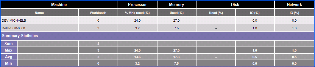 ターゲットサーバが複数ある場合、サマリ統計テーブルはSUM、AVG、MAX、およびMINの値と共に表示されます。