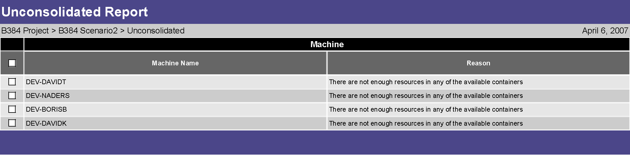 「未統合ワークロード」レポートでは、統合計画に含まれていない統合候補ワークロードと、それらがPlateSpin Reconに含まれなかった理由の説明を確認できます。