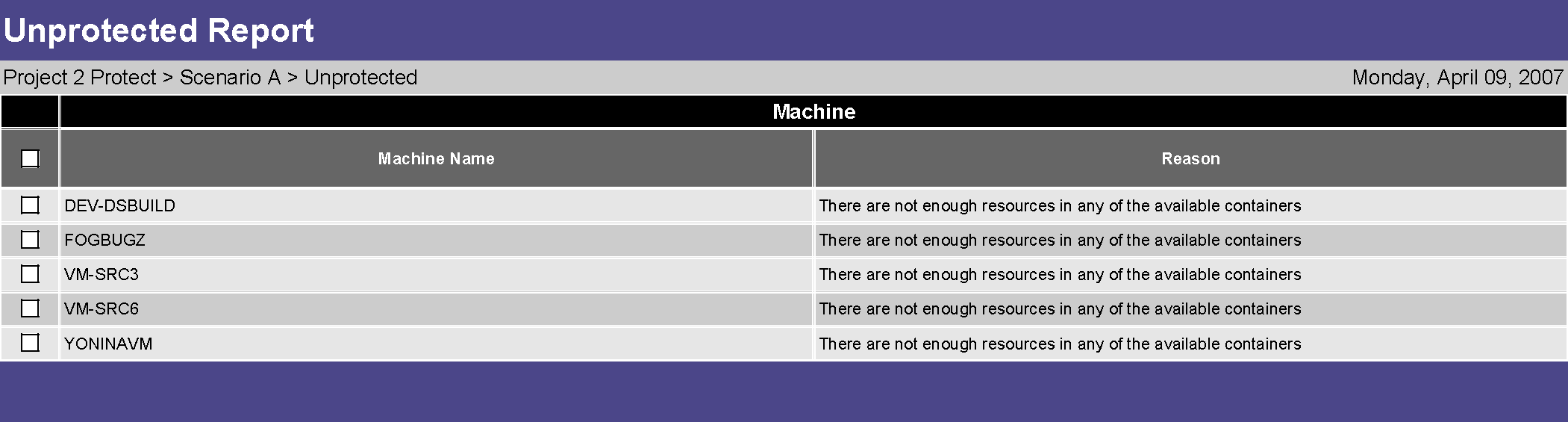 「非保護ワークロード」レポートでは、保護計画に含まれていない統合候補ワークロードと、それらがPlateSpin Reconに含まれなかった理由の説明を確認できます。