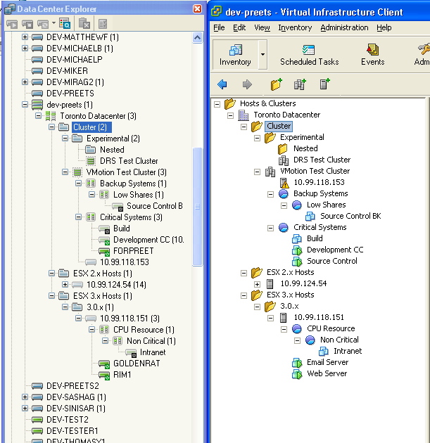 Virtual Centerがインベントリされると、その関連付けられたマシンがData Center Explorerに階層で表示されます。これは、すべてのデータセンター、フォルダ、クラスタ、およびプールを含むVMware Virtual Infrastructure Client階層を反映するものです。