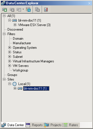 Data Center Explorerは、PlateSpin Reconの主なビューの1つです。これは、データセンターの資産を整理、監視、表示、および管理するために使用されます。PlateSpin Reconではそれらの情報を使用して、動的チャートを表示したり、パフォーマンスレポートを生成したり、パフォーマンス予測を生成したりします。