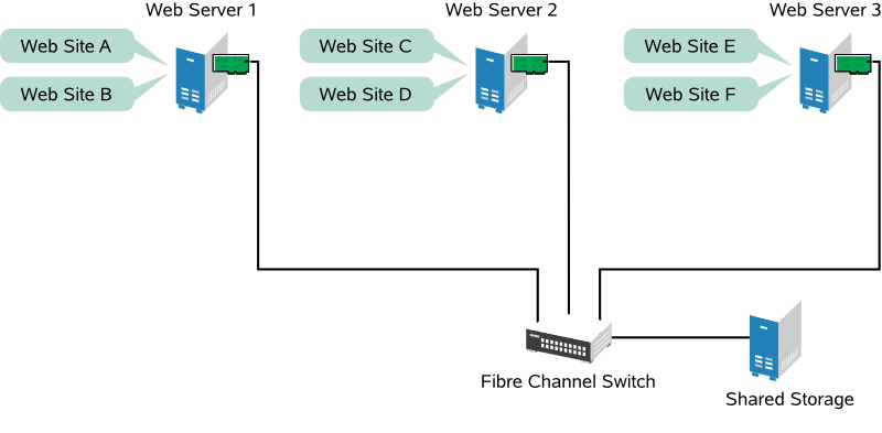 サーバ3台でクラスタが構成され、それぞれのサーバにWebサーバをインストールしたと仮定します。クラスタ内の各サーバが、2つのWebサイトをホストしています。各Webサイトのすべてのデータ、グラフィックス、Webページコンテンツは、クラスタ内の各サーバに接続された、共有ディスクサブシステムに保存されています。次の図は、このクラスタの構成を示しています。