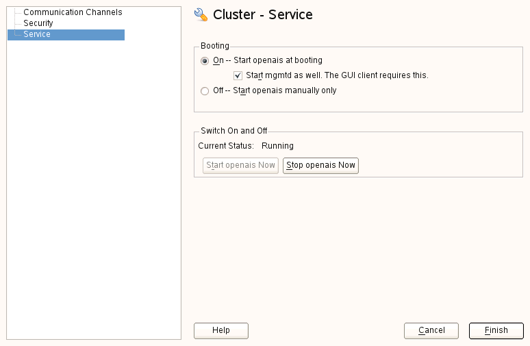 HAパッケージをインストールした後、YaSTでクラスタの初期セットアップを設定できます。これには、ノード間の通信チャネル、暗号化通信の使用などのセキュリティ面、OpenAISのサービスとしての起動などがあります。