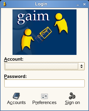 初めてGaimを実行するとき、または2回目以降にGaimを起動するとき、どのアカウントもセットアップしていない場合は、ダイアログボックスが自動的に開きます。 dialog opens automatically.