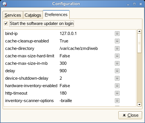 ZENworksツールを設定するには、[Software Updater]ウィンドウでをクリックします。ダイアログに3つのタブが表示されます。