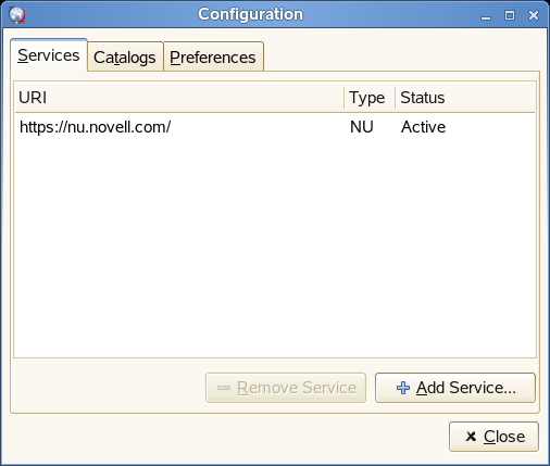 SUSE Linux Enterprise Desktop isをインストールすると、2種類のサービスが事前設定されます。ZYPPサービスとしてのインストールソース(DVD、CD-ROM、またはネットワークリソース)、およびサービスとしてのSUSE Linux Enterpriseアップデートサーバ(製品登録時に追加される)です。通常、これらの設定を変更する必要はありません。これらのサービスが表示されない場合は、ターミナルからrootとしてsuse_registerコマンドを実行してください。サービスが自動的に追加されます。