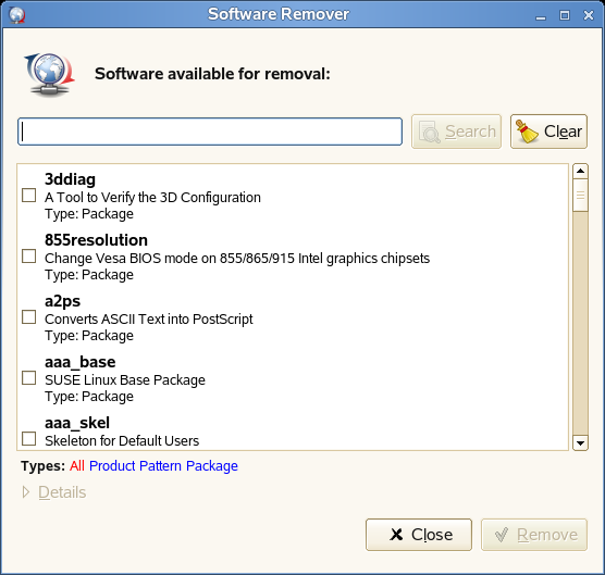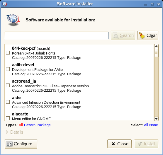 ソフトウェアパッケージをインストールするには、の順にクリックするか、またはターミナルからzen-installerと入力します。このインタフェースはSoftware Updaterとほとんど同じですが、パッケージを検索したり、リストをフィルタリングするための検索パネルが違います。