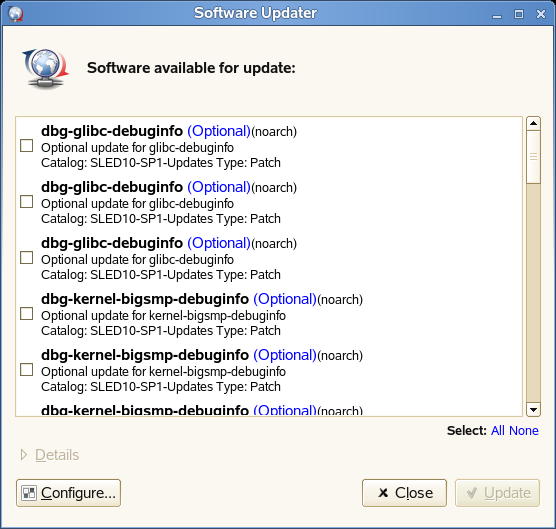 NOTE:Novellから公式にリリースされたアップデートは、パッチとして表示されます。他のソースから提供された新しいバージョンのパッケージは、パッケージとして表示されます。