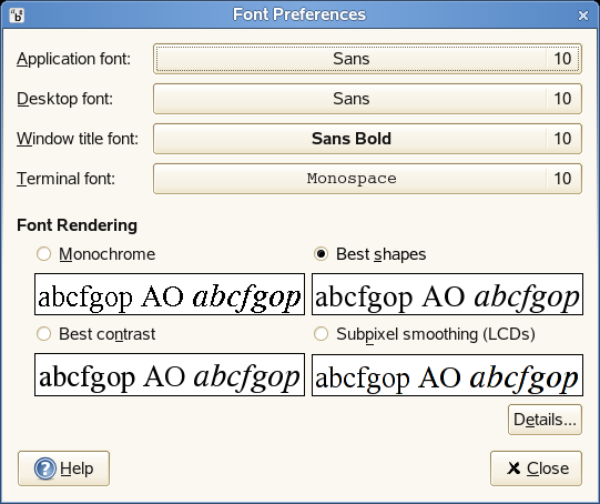 Best Contrast(コントラストを最高に設定): 最もシャープなコントラストを使用してフォントを調整し、文字の縁が滑らかになるようにアンチエイリアス処理を行います。 このオプションは、視覚障害のあるユーザを対象としたGNOMEデスクトップのアクセス補助を増強する機能です。