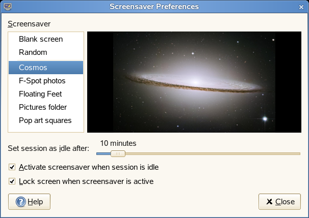 リストからスクリーンセーバを選択します。 現在選択されているスクリーンセーバが、小さなプレビューウィンドウに表示されます。 画面がアイドル状態になってから、スクリーンセーバが起動するまでの時間と、スクリーンセーバが起動したら、画面をロックするかどうかを指定します。