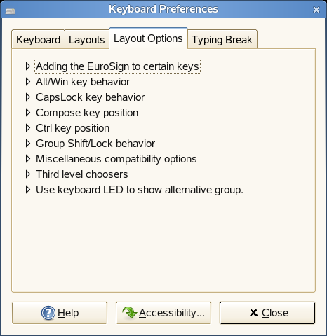 キーボードレイアウトオプションの設定には、レイアウトオプションタブページを使用します。これらのオプションは、キーの動作や他のキーボード設定を決定するものです。