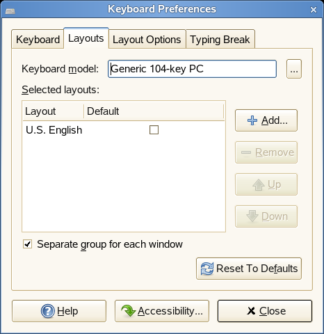 ドロップダウンリストからキーボードのモデルを選択し、ナビゲーションボタンを使用して選択されたレイアウトを追加または削除、または利用可能なレイアウトのリストから選択します。